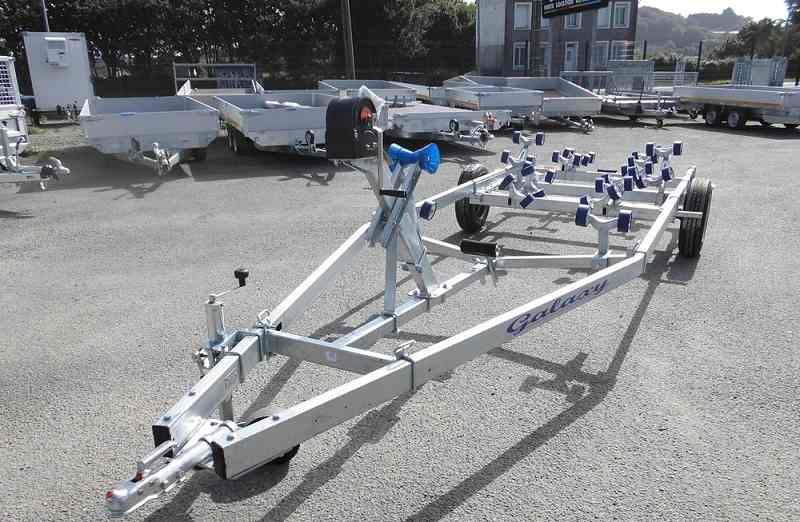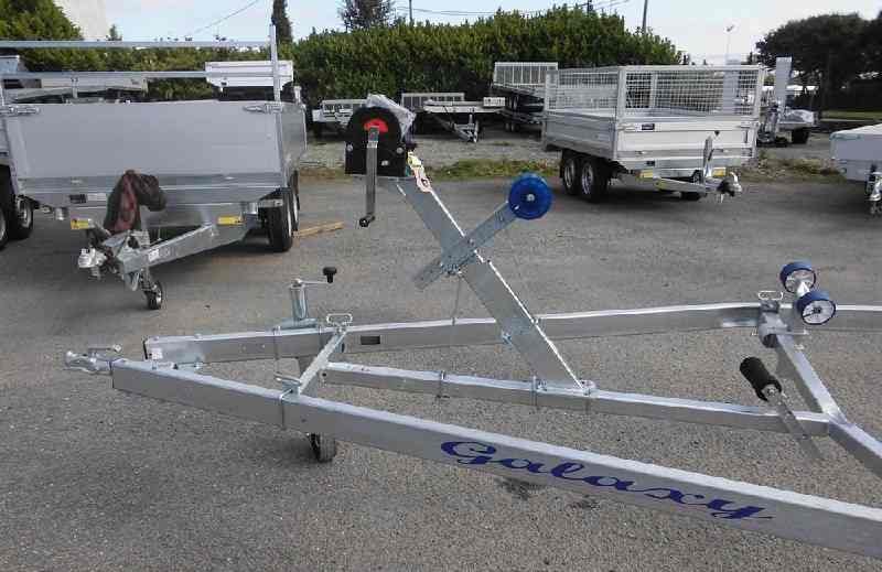 Essieu non freiné non bain d’huile avec suspension caoutchouc / Conception avec des longerons donc non basculants / Roues identiques aux remorques routières gamme Galaxy / treuil / Support de treuil réglable / Butée d’étrave réglage 3D / Roue jockey