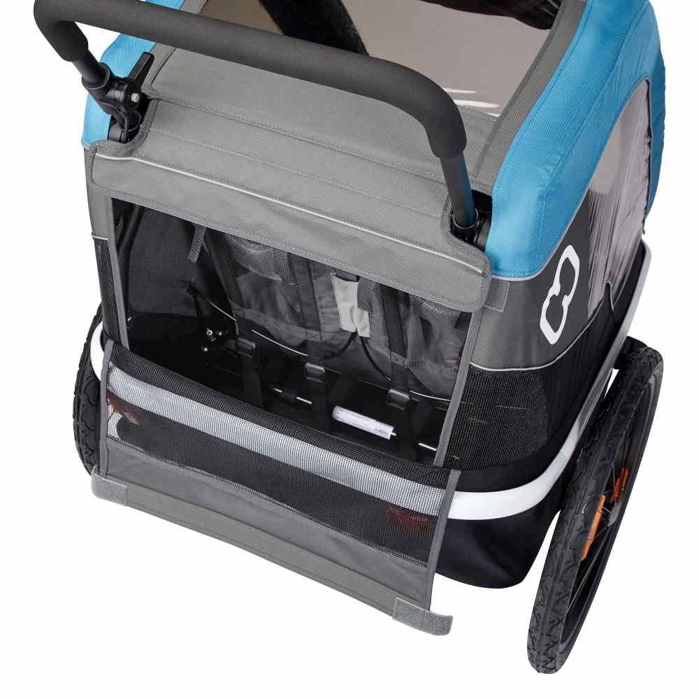 Remorque à vélo stable et polyvalente, transformable en poussette, pour 2 enfants à partir de 6 mois.