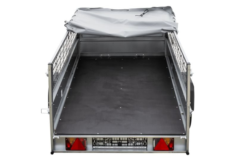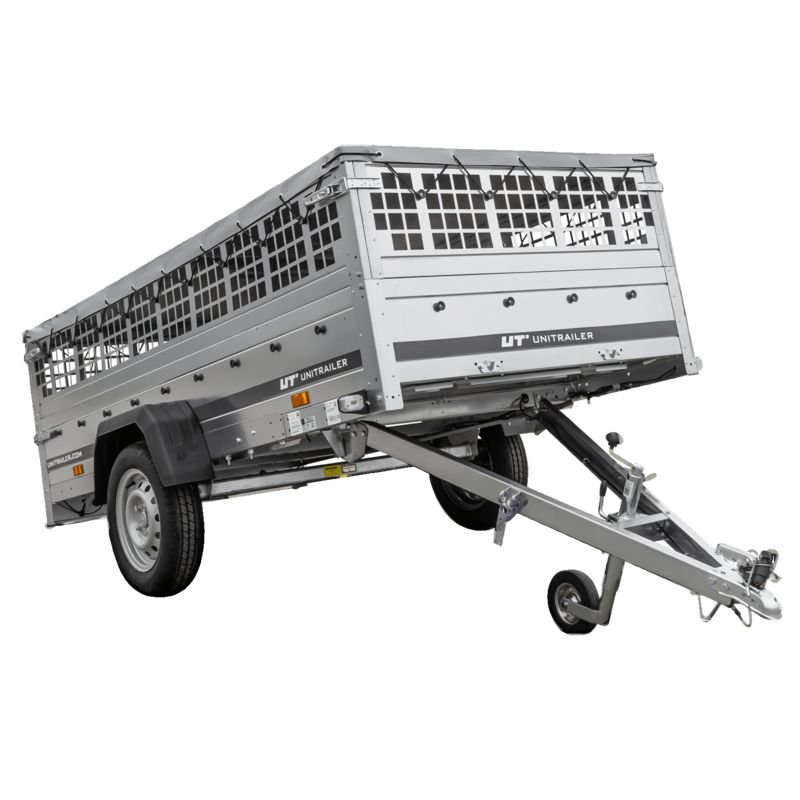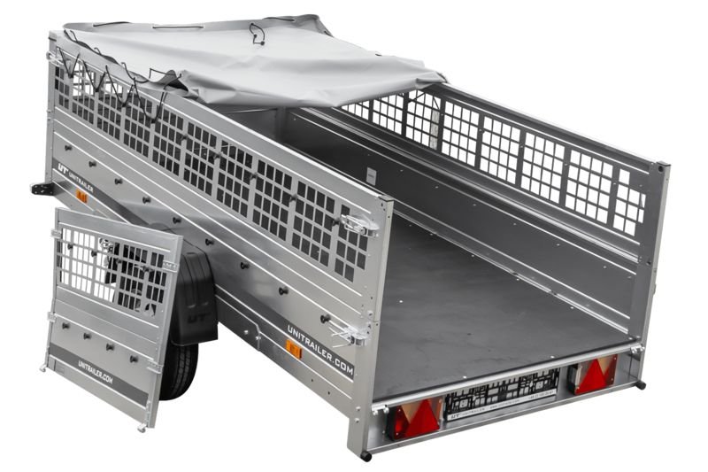 CHÂSSIS – 1 essieu du fabricant Knott ou ALKO – fabriqué sur commande pour Unitrailer. Taille de roue : 155/70 R13. Timon en V. Suspension : indépendante, ressortant sur un arbre de torsion. Roues à l’extérieur de la zone de chargement.