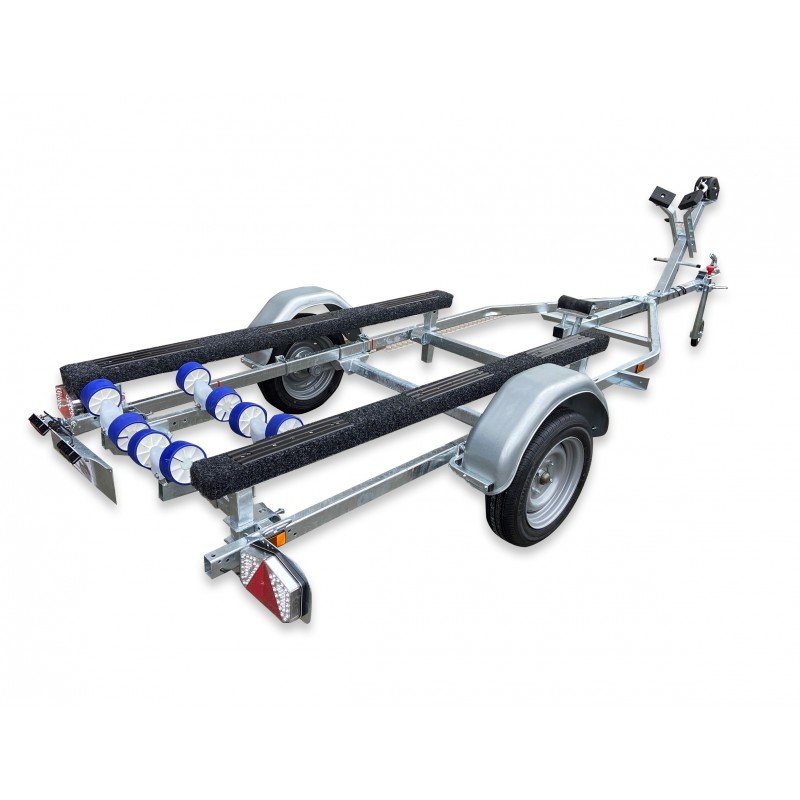 Remorque Sunway G380PT18 idéale pour tous les bass boats alu ou fibre, réalisée avec un rouleau » d’attaque » sur l’arrière et de 2 supports moquettés de grande longueur assurant une surface de contact importante entre la barque et ce support, évitant ainsi toutes les déformations de coques qu’engendrent d’autres systèmes.