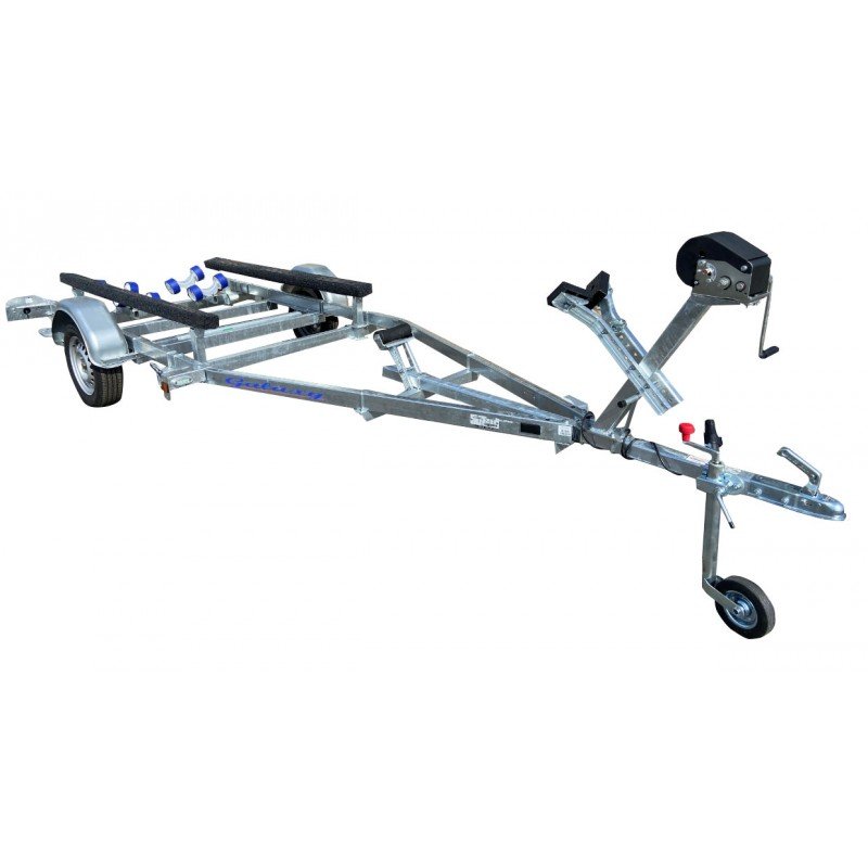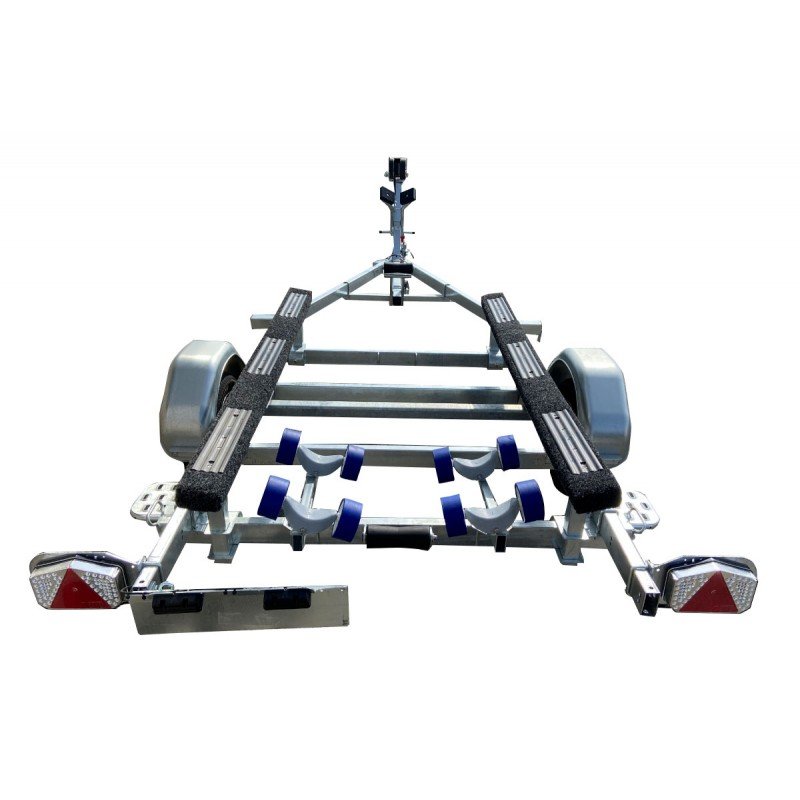 Remorque Sunway G510PT19 idéale pour tous les bass boats alu ou fibre, réalisée avec un rouleau » d’attaque » sur l’arrière et de 2 supports moquettés de grande longueur assurant une surface de contact importante entre la barque et ce support, évitant ainsi toutes les déformations de coques qu’engendrent d’autres systèmes.