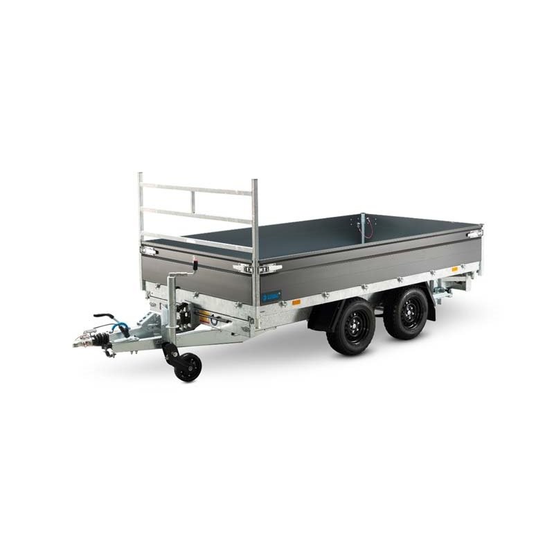 Cette remorque existe en plusieurs dimensions pour s’adapter aux différents besoins. Les tailles varient de 335 x 180 cm à 405 x 200 cm. Sa charge utile atteint jusqu’à 2700 kg selon la version choisie. Elle est équipée de roues 185/70R13 C offrant une bonne adhérence. Son plancher en acier galvanisé garantit une résistance optimale aux chocs. Les ridelles en aluminium de 40 cm sont solides et facilement amovibles. Son système de freinage assure une sécurité maximale sur route. Le vérin hydraulique assure un basculement fluide et efficace.
