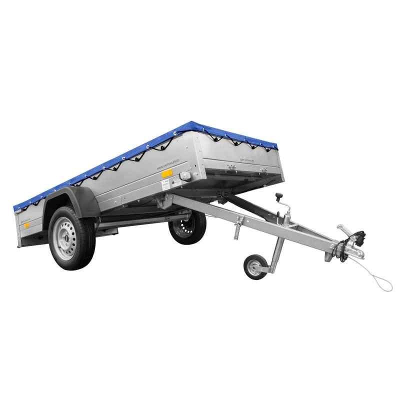 Une remorque à un essieu avec une roue de support et un châssis GARDEN TRAILER 264 KIPP conçu pour le transport de matériaux, ayant un essieu. Une roue de support qui permet un déplacement confortable avec une remorque debout. La surface de transport aux dimensions de 264x126x30 mm et PTAC de 750 kg vous permettra de charger sans problème des matériaux plus longs et plus larges. La solidité de la remorque est assurée par un châssis porteur en acier de construction à résistance accrue et une surface de transport en contreplaqué étanche.
