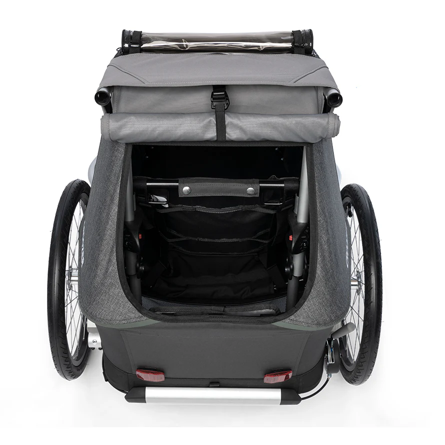 Croozer fournit tous les accessoires nécessaires pour une utilisation immédiate : drapeau de signalisation, bâche anti-pluie, feu arrière, kits de transformation et attache pour timon. Vous n’avez rien à acheter en plus pour commencer à profiter de votre remorque.