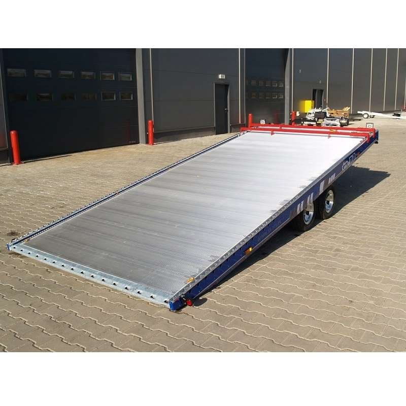 La plateforme basculante est en aluminium avec une surface antidérapante. Le système de fixation AIRLINE permet d’attacher solidement les charges. Les côtés sont revêtus par poudrage pour une finition durable. La poutre d’éclairage arrière se replie automatiquement lors de l’inclinaison de la plateforme. L’angle de chargement est réduit à seulement 10°, facilitant le chargement des véhicules.