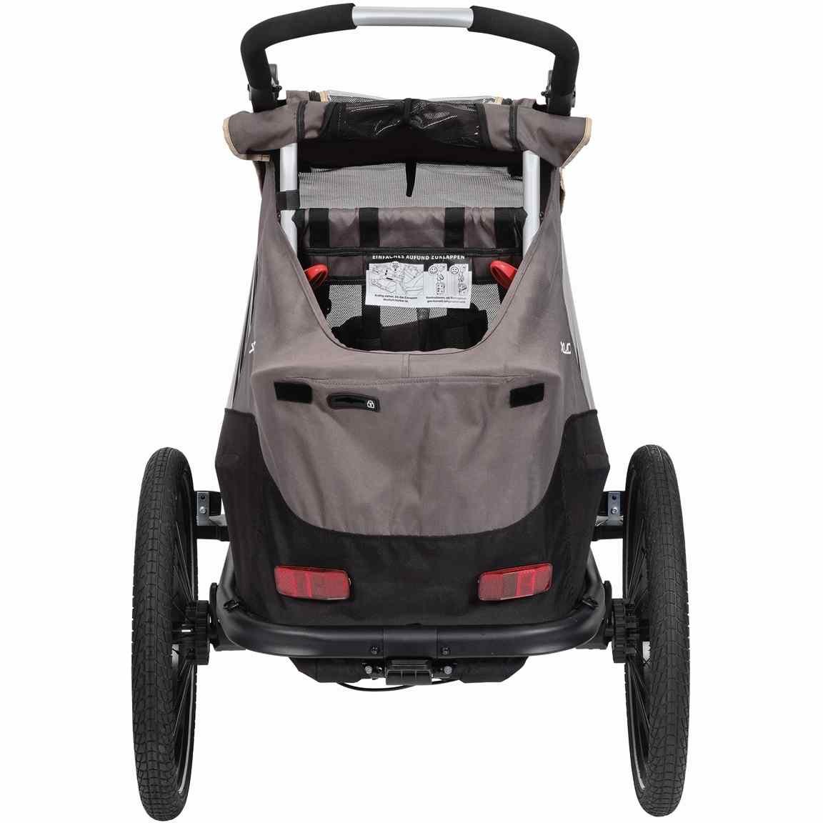 • monoplace, avec timon y compris attelage de remorque, fanion de sécurité, roue de buggy et barre de poussée réglable, capote anti-insectes et anti-intempéries,système de pliage innovant, frein de parking à pédale pour bloquer les deux roues, matériel réfléchissant, marquages de hauteur et de largeur.